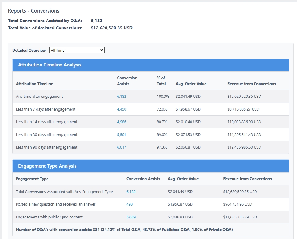 So we'll report back on the time line between the Q&A engagement and the sale, the percentage of your published Q&A's that have conversion attribution, and many more details that are valuable fro you to know about. We'll highlight a few of these items based on the above example and communicate what's notable about them.