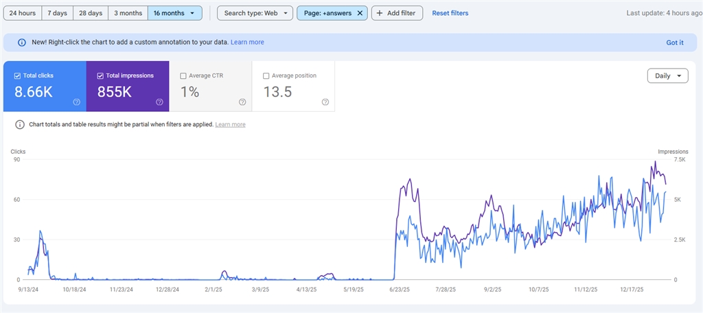 When we first got in touch with this customer, they only cared about their product page traffic and didn't care about the customer's being served through informational pages about the product. We tried to explain that wasn't going to be good for their customers...we remember very clearly they said "I don't want to say I don't care about my customers, but I just want more traffic.". This mentality is far too common....and it needs to change. Interestingly, this customer signed up for the service but they didn't answer over 95% of their customers questions! We had a heart to heart with the customer and reinforced the point of why helping their customers through answering questions was critical for the performance of their SEO....and they finally started servicing their customer. We had that talk in September 2024 and see what's happened to their Q&A knowledge base since: