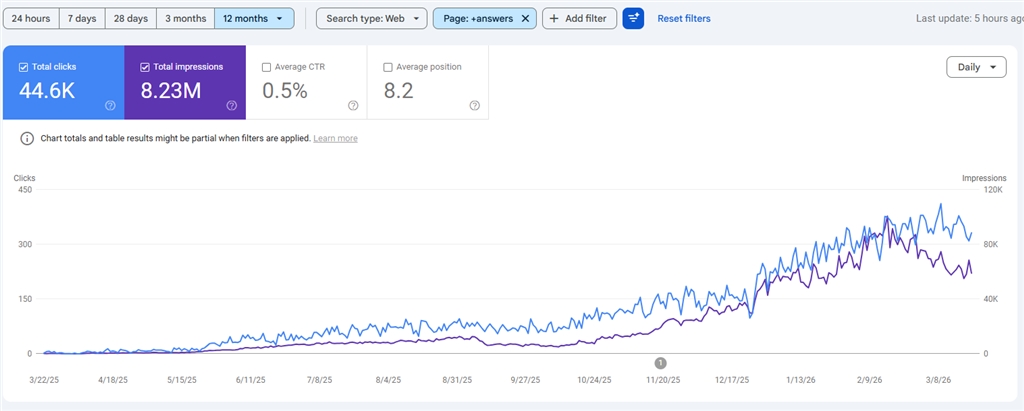 If you provide that....Google will reward you. It needs to reward you...because they need that content to satisfy the searchers (and so will any Google competitor). See this example of a customer who started with us in March of 2024 and then see the activity over the first 12 months to their Q&A knowledge base where it drives over 600K organic visitors over the first year of having the account.