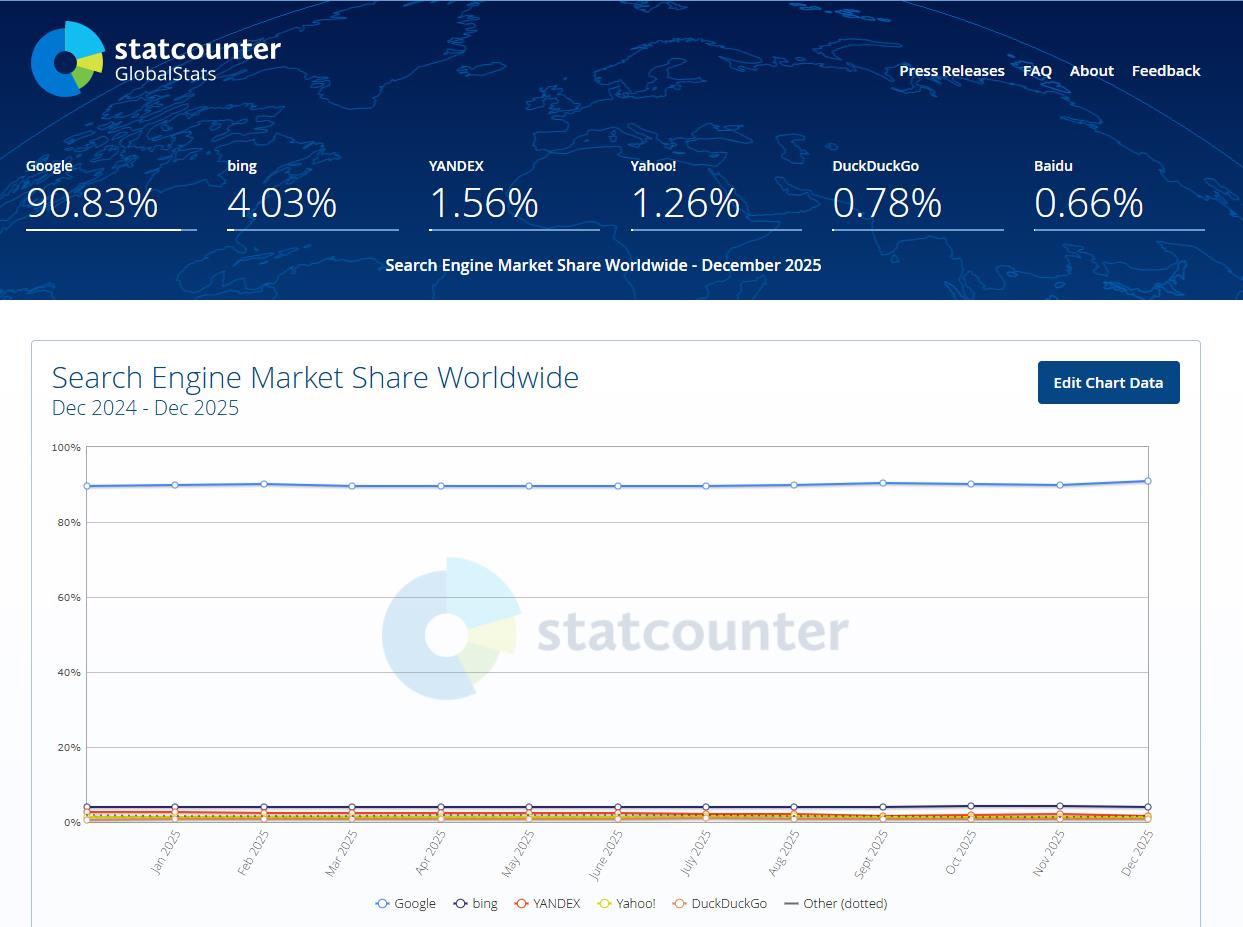 Well...things continue to shift but not as much as you would think, or how you may be thinking it's going. As of today, January 8, 2026.....Google is still by far the most used search engine on the planet with 90% of searches going to/through Google. See here:
