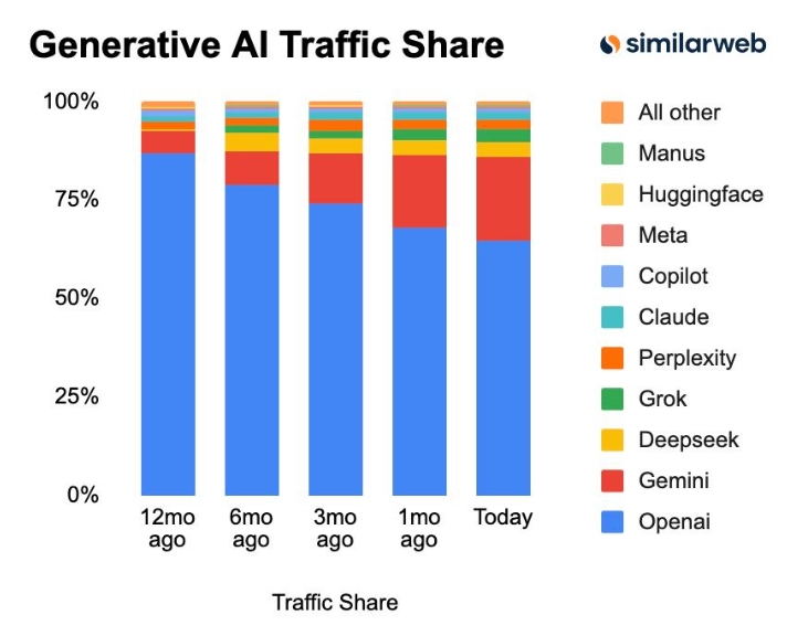 You can see that Google Gemini's global market share just reached 21.5% as of today.