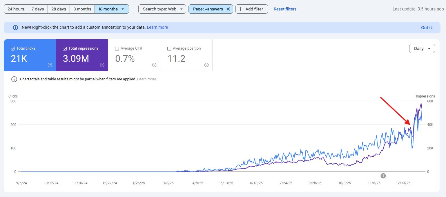 So....not only is Google's organic search statistics dramatically higher than any other source of organic visibility and traffic....but it's very quickly gaining a large percentage of the Generative AI searches/questions as well. Answerbase has continued to see ecommerce merchants thrive through these updates and again (just like for the last 3 years)....the Google December 2025 core update (just finishing within the last 30 days) has shown dramatic increases in positions, impression, and traffic to Q&A content produced through Answerbase. See example here: