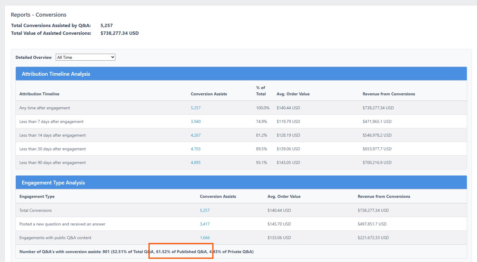 Since Answerbase tracks and reports back on the value of all of the engagement and traffic from Q&A, we work with you to ensure you're getting an ROI. We know and report back on exactly how many conversions Q&A has assisted in, what Q&A's are leading to conversion...and the orders that it assisted in....all of which is reported back to you in our Conversion Reports. See a sample of that here which is a merchant that has grown 40% year over year, we're over 20% of their traffic, and 61% of their Q&A pairs have conversion attribution. They have seen a 10X ROI in PURE PROFIT, after taking into account their margins and their average "marketing touches" to a sale.