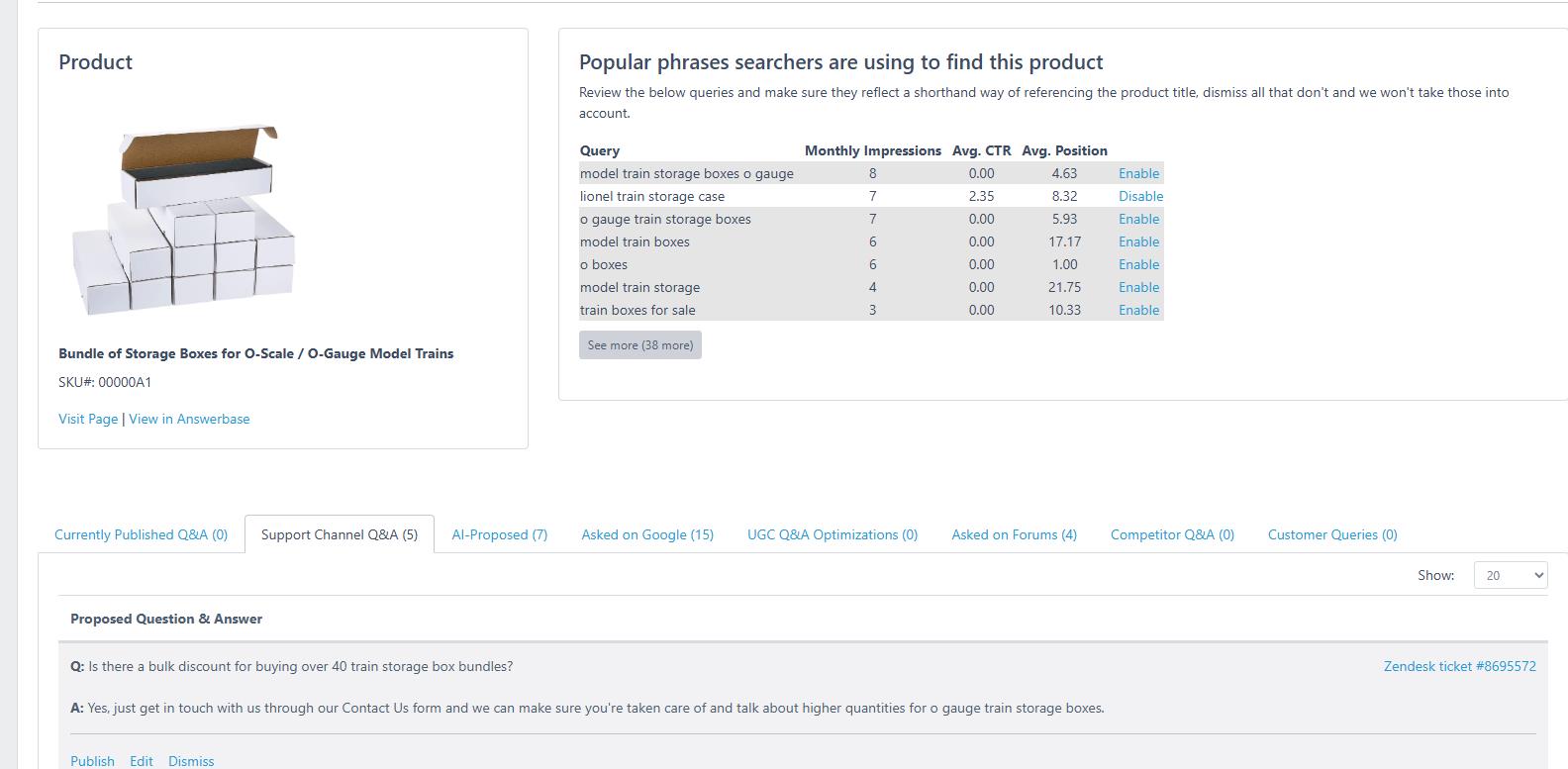 See preview of the AI-Enhanced optimization workflow here where we aggregate the demand for product information from what's being asked through organic searches, what you've already answered through your support channels (we can read through years of the questions you've already answered through chat, tickets, etc.), what's been asked and answered on your competitor sites, what's being asked on forums, etc.
